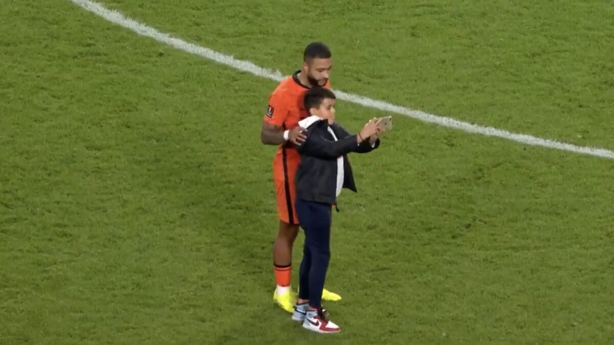 Virgil van Dijk had een aantal dagen geleden geen zin in opdringerige fans met telefoons, maar net als Ronaldo nam Depay gisteravond in de wedstrijd Nederland - Montenegro (4-0) toch de tijd voor een broekie die ff een fotootje wilde maken: "Het hoort niet, maar als hij toch al op het veld is...".