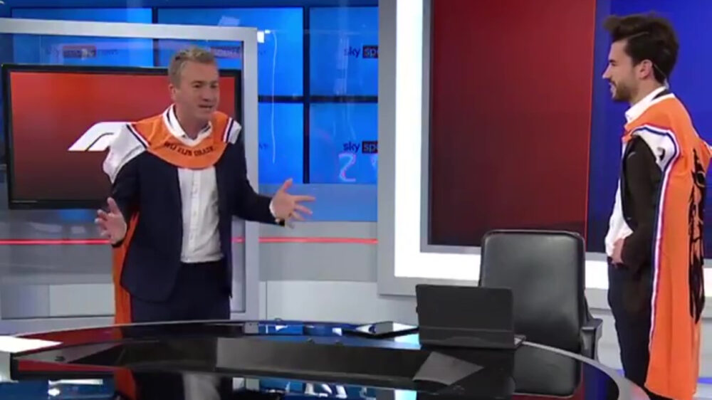 De meeste F1-verslaggevers uit het buitenland zijn het er inmiddels wel over eens: wat zich afgelopen weekend in Zandvoort afspeelde heeft nog nooit iemand gezien. Deze mannen van Sky Sports bespreken Max-mania nog even, uiteraard met de bijbehorende Juichcape.