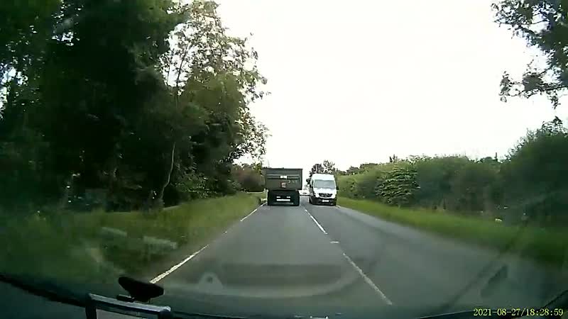 Engelsman blaast even vol gas langs een plotseling afslaande tractor