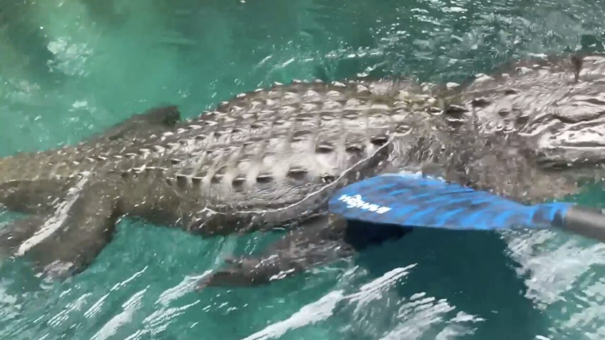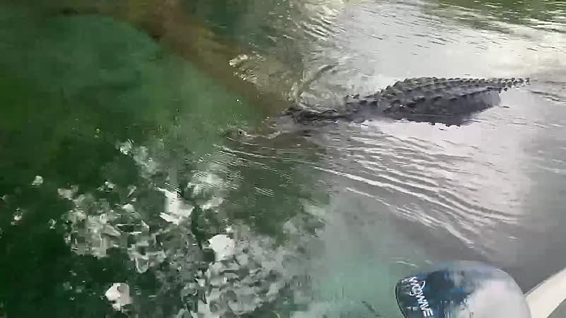 Hongerige alligator komt ff eten schooien bij vrouw op surfplank