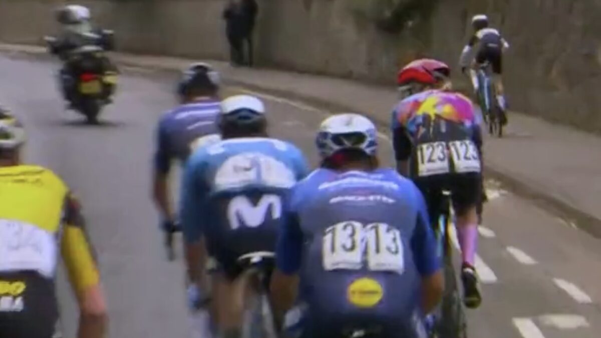 Sta je als professional toch even raar te kijken als je in de Tour of Britain bergop 'eraf' wordt gereden door een amateur die ff het stoepje meepakt. Keurig gedaan jochie, als beloning mag je de bidon van Jumbo-renner Pascal Eenkhoorn hebben.