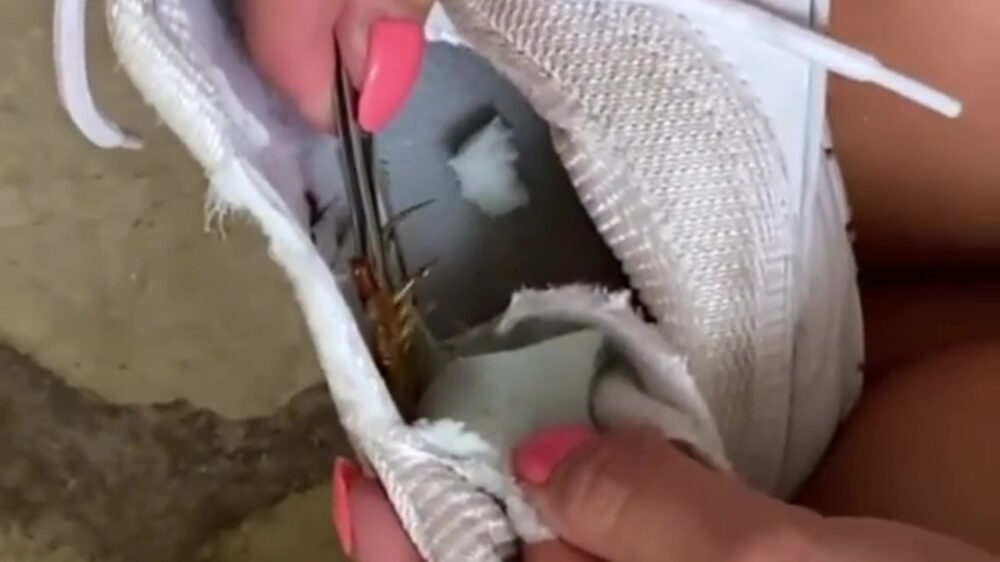 Iedereen die vroegâh de film "Arachnophobia" heeft gezien weet dat je op sommige plekken in de wereld je schoenen moet checken voordat je ze aantrekt. Deze dame deed dat gelukkig ook, al hadden wij gewoon Hans geroepen. GET ZE FLAMMENWERFER!