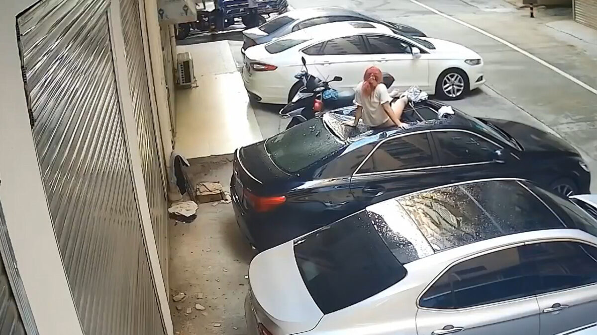 Opmerkelijke beelden uit Taipei, Taiwan als een jongedame tijdens het figuurzagen uit het raam valt en op het dak van een geparkeerde auto klettert. De pechvogel zou van een vensterbank zijn uitgegleden, maar heeft geluk dat haar val ietwat wordt opgevangen door en autodak. Een minuut later komt de veroorzaker naar beneden gerend. Sorry schatje!