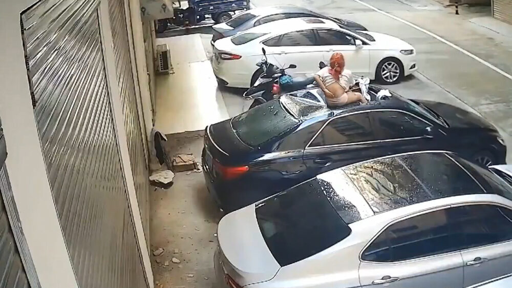 Opmerkelijke beelden uit Taipei, Taiwan als een jongedame tijdens het figuurzagen uit het raam valt en op het dak van een geparkeerde auto klettert. De pechvogel zou van een vensterbank zijn uitgegleden, maar heeft geluk dat haar val ietwat wordt opgevangen door en autodak. Een minuut later komt de veroorzaker naar beneden gerend. Sorry schatje!