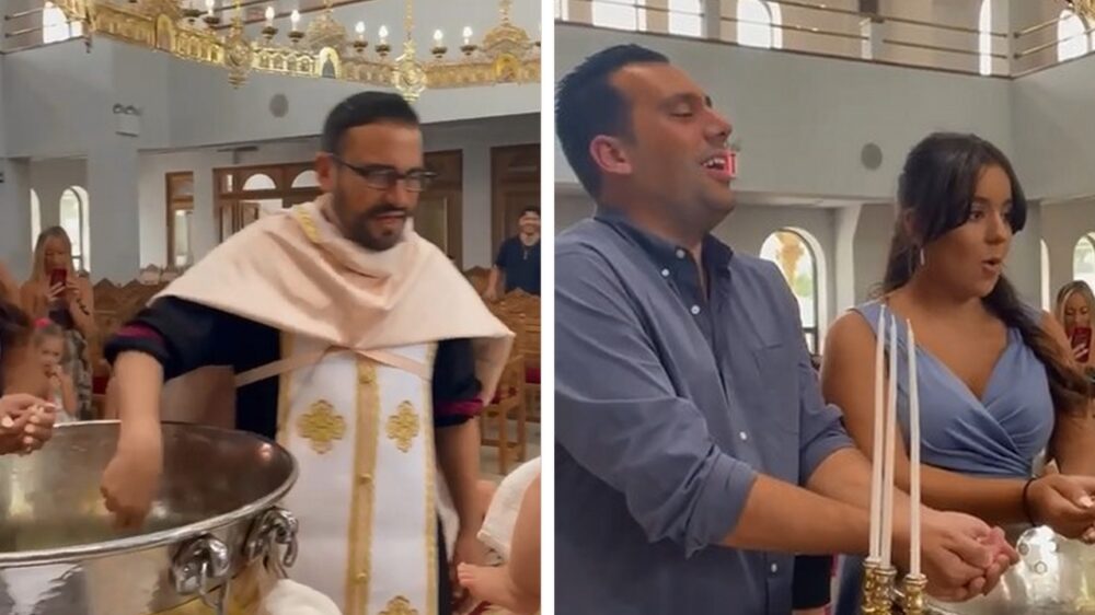 Ik doop u in de naam van de Vader, de Zoon en de Heilige... Zo, hier heb je wat doopwater terug!