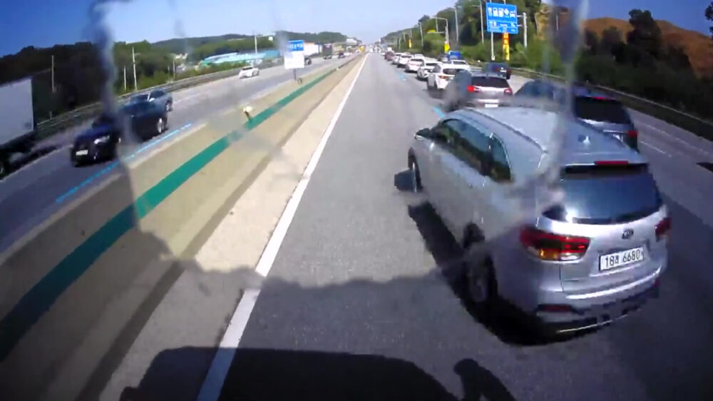 Bij het invoegen op een andere weghelft is het vaak handig om éven te kijken of er andere weggebruikers in de weg zitten (pun intended), maar dat heeft deze bestuurder niet zo goed begrepen. Gooi 'm er gewoon voor joh, tuuuuurlijk!