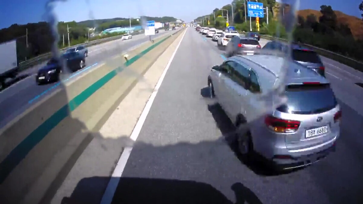 Bij het invoegen op een andere weghelft is het vaak handig om éven te kijken of er andere weggebruikers in de weg zitten (pun intended), maar dat heeft deze bestuurder niet zo goed begrepen. Gooi 'm er gewoon voor joh, tuuuuurlijk!