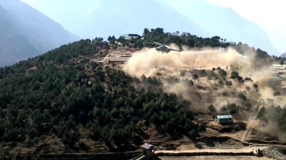Een helikopter (MI-17) zorgt dankzij z'n landing in Namche Bazar ervoor dat iedereen een paar weken lekker zand ophoest *KUCH*