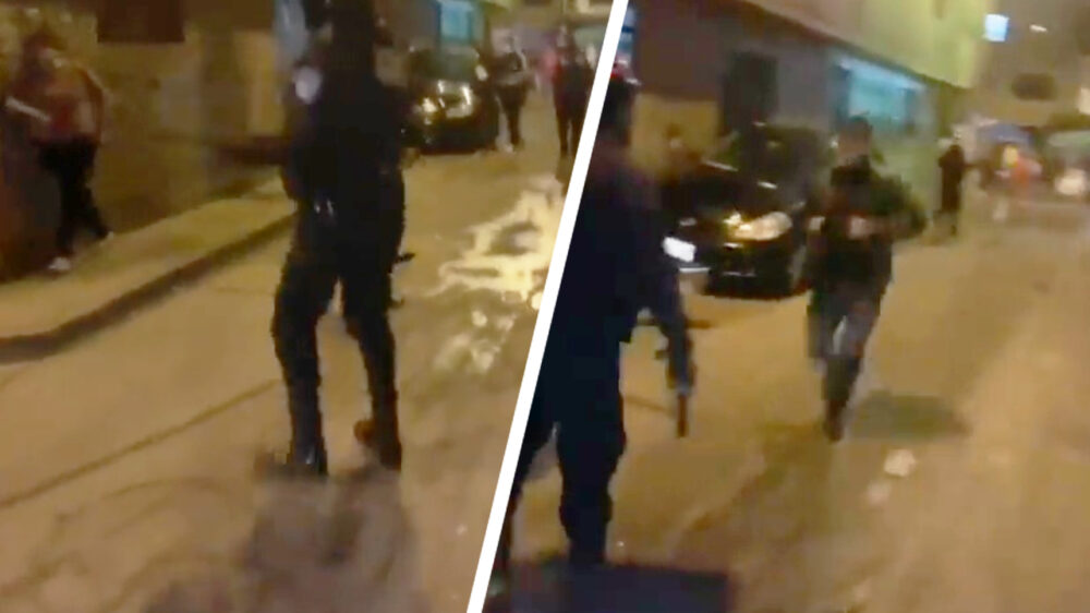 Natuurlijk mag je het niet eens zijn met de politie, en natuurlijk mag je je stem laten horen. Wat echter een minder goed idee is is een bewapende ME'er die net een waarschuwingsschot heeft gelost bodychecken, al lijkt deze mafklapper er goed mee weg te komen.