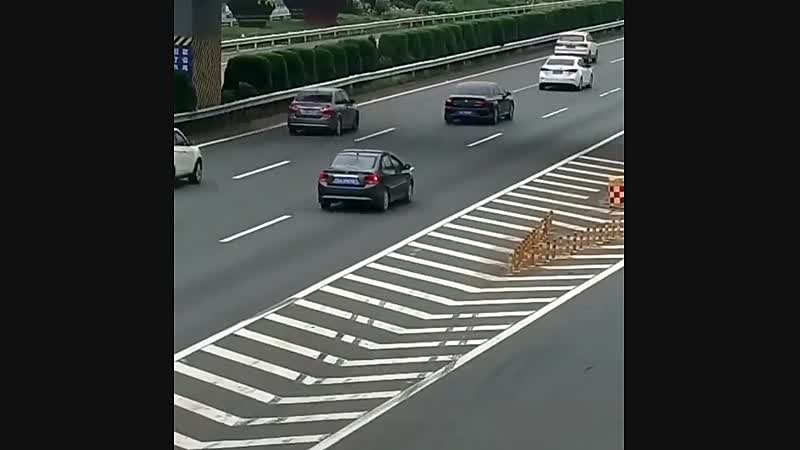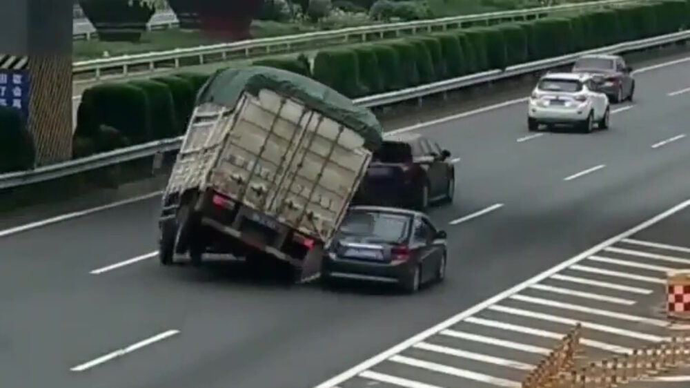 Je afslag missen en dan praktisch stil gaan staan op de snelweg, da's wel een redelijke garantie voor een keiharde crash. Deze vrachtwagen kan de auto nog net ontwijken maar de vangrail staat toch net te dichtbij.