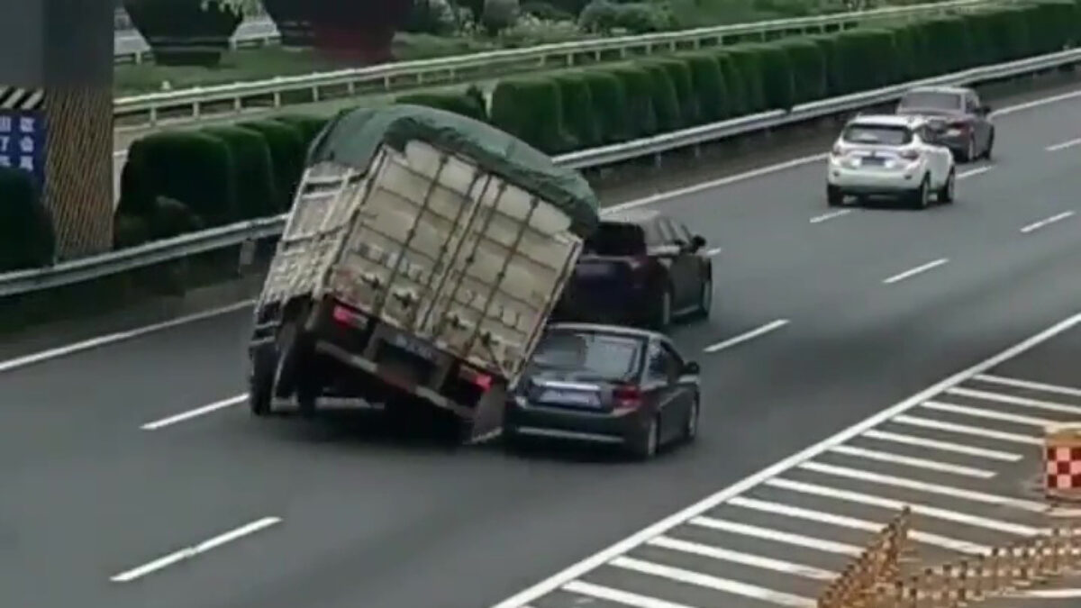 Je afslag missen en dan praktisch stil gaan staan op de snelweg, da's wel een redelijke garantie voor een keiharde crash. Deze vrachtwagen kan de auto nog net ontwijken maar de vangrail staat toch net te dichtbij.