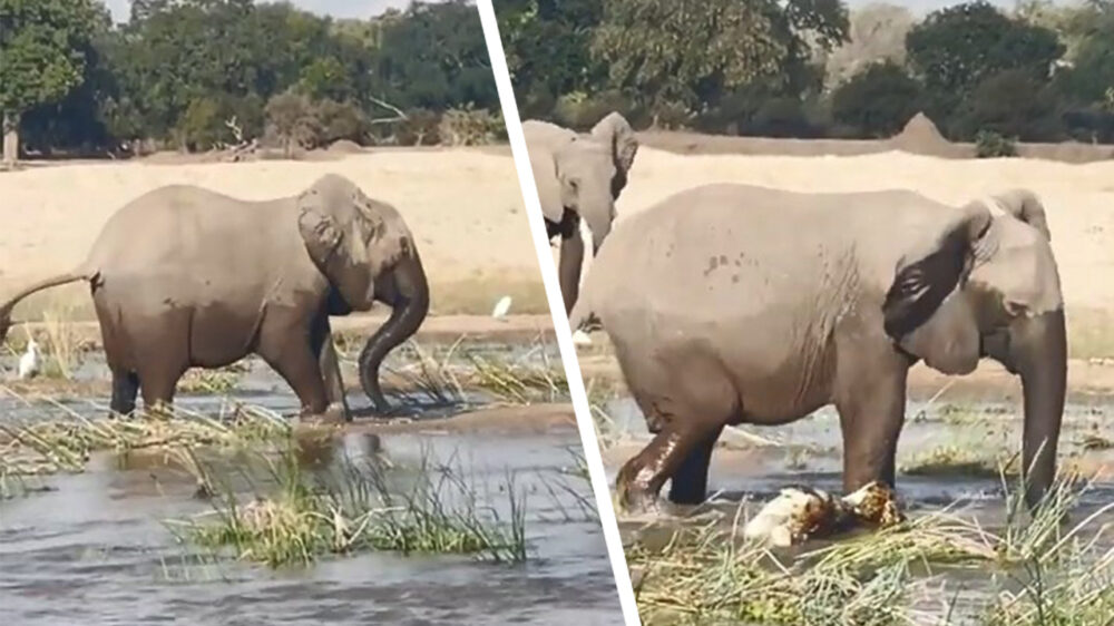 Olifant beschermt haar kalf en doodt krokodil door hem te vertrappen