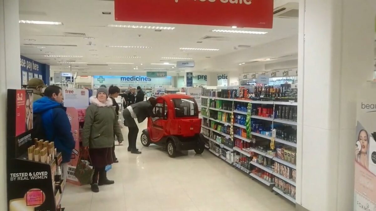 Brommobiel neemt verkeerde afslag en komt in winkel terecht Fails