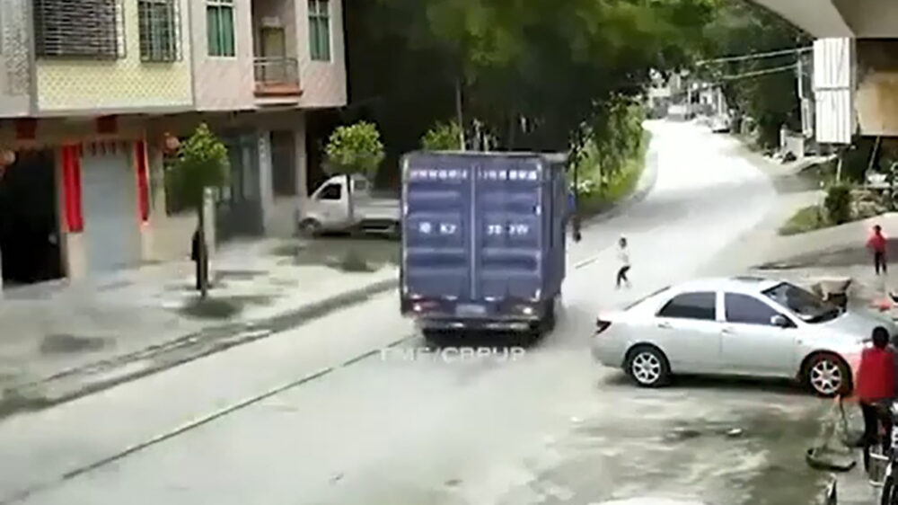 Een vrachtwagenmalloot rijdt veel te hard in de stad Maoming in de provincie Guangdong en weet nog nét een meisje te ontwijken dat plotseling een weg oversteekt. Gevalletje close call Ho Lee Fook!