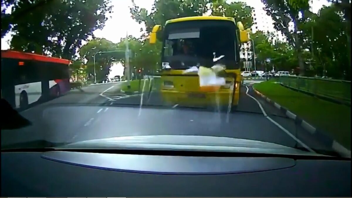 Voorruit van stadsbus houdt het voor gezien tijdens het remmen Fun