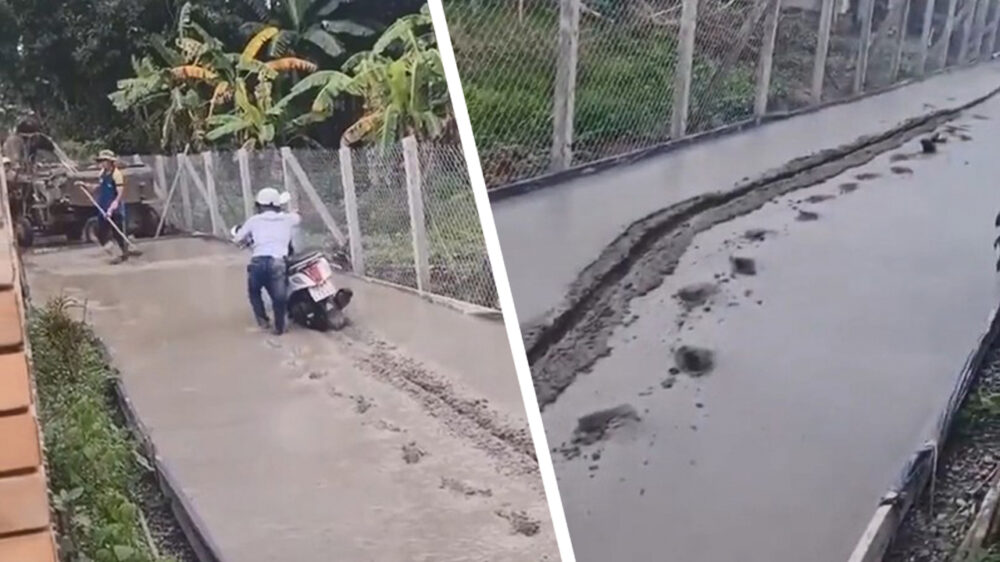 Ergens moeten we bewondering hebben voor deze beste man. Waar het merendeel van de mensheid al na 30 cm was afgestapt en teruggelopen, omdat je erachter komt dat je over nat cement rijdt, houdt deze vent stug vol en blijft hij keurig doorploegen. Volhouder!