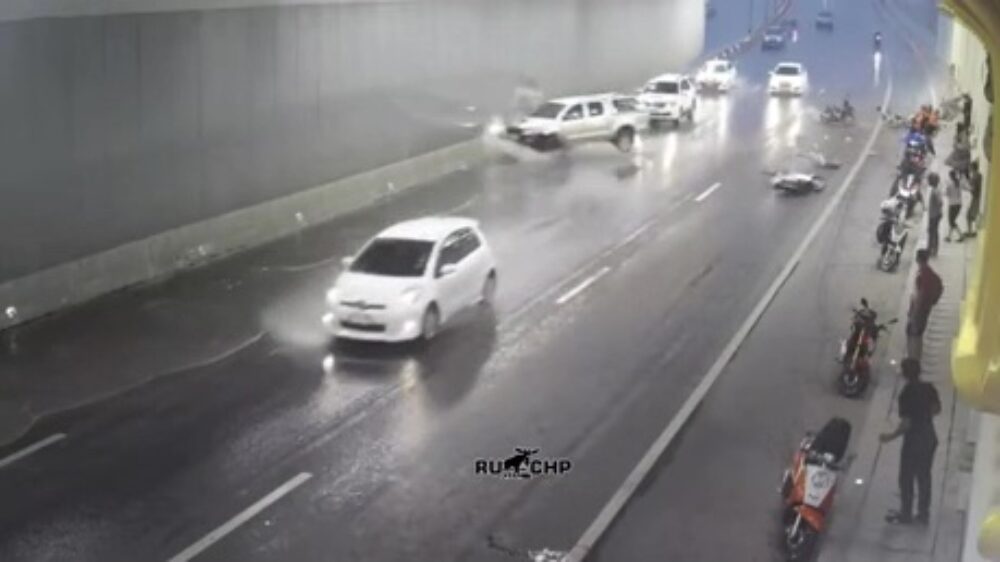 Aquaplanende auto neemt een heleboel schuilende motorrijders met zich mee
