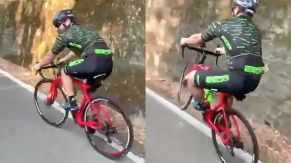 Wielrenner doet ff dikke wheelie en rijdt moeiteloos de berg op Fails