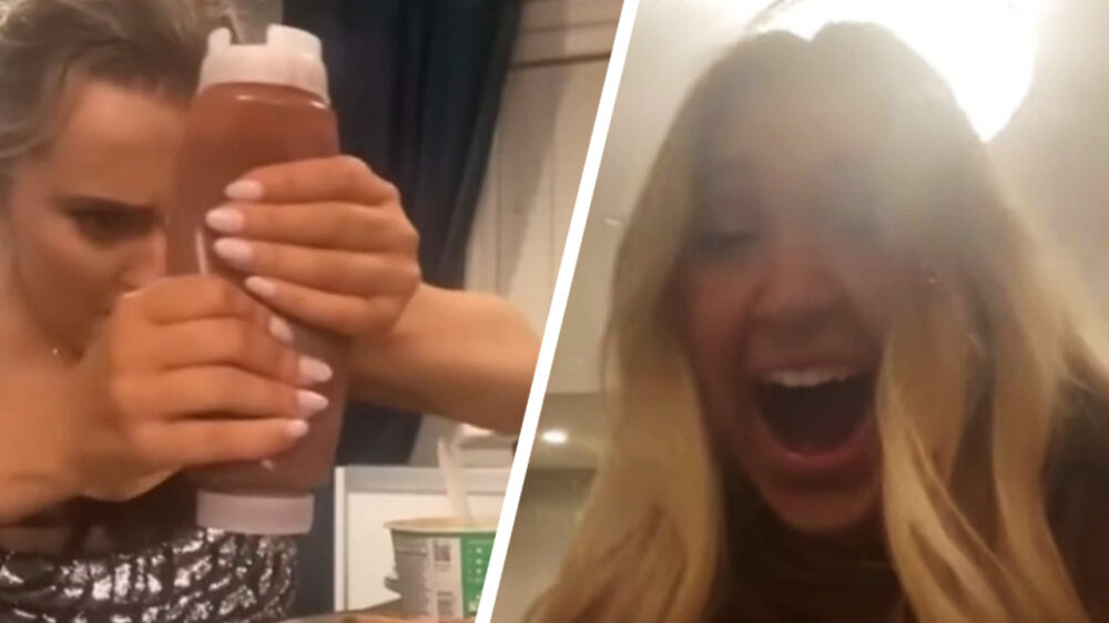 Nee stelletje viespeuken, dáár hadden we het niet over. Deze dame is namelijk gewoon wat onhandig met de ketchupfles!