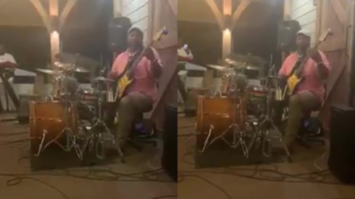 Gitaarspelende drumbaas gaat lekker los op een bruiloft