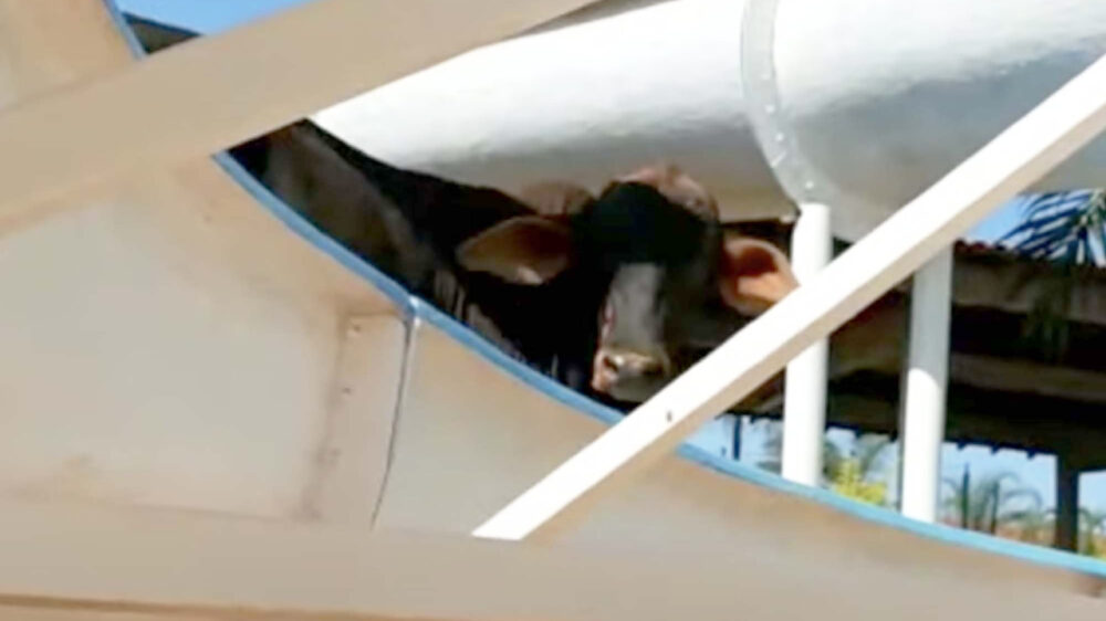 Koe ontsnapt aan het slachthuis en maakt meteen een ritje over een waterglijbaan