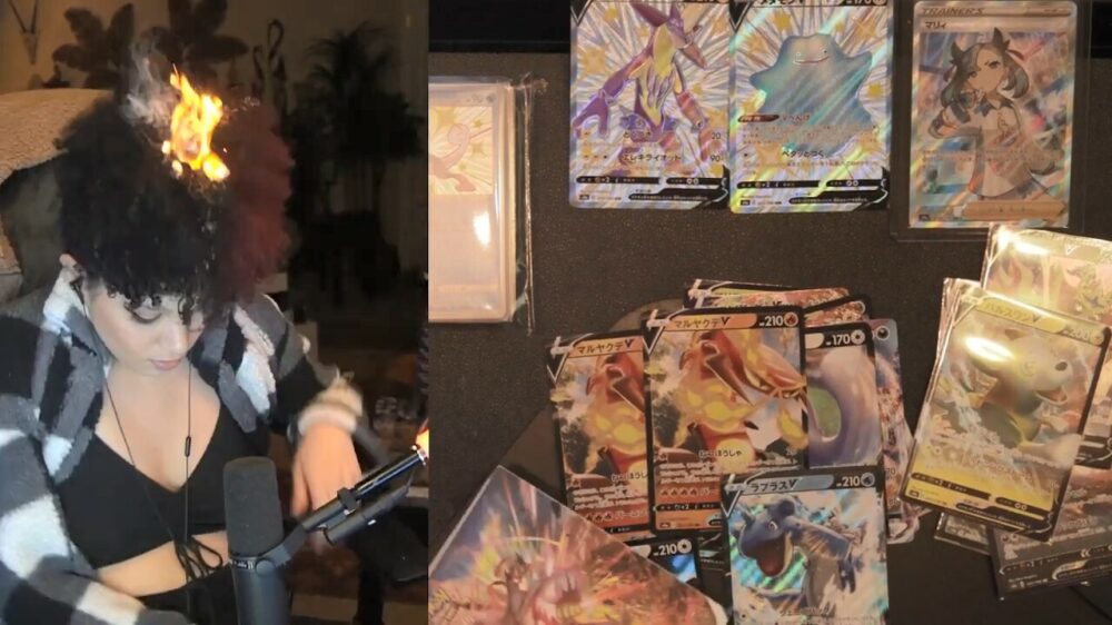 Streamer Woofy is op #Twitch bezig met het openen van haar pakje Pokémonkaarten als ze plotseling letterlijk on fire staat wanneer ze vooroverbuigt om iets te pakken en d'r haren door een kaars in brand vliegen. Woof!