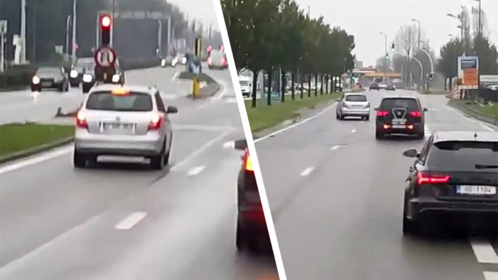 Belg ramt een vluchtheuvel maar blijft doorrijden ondanks een geblokkeerd wiel