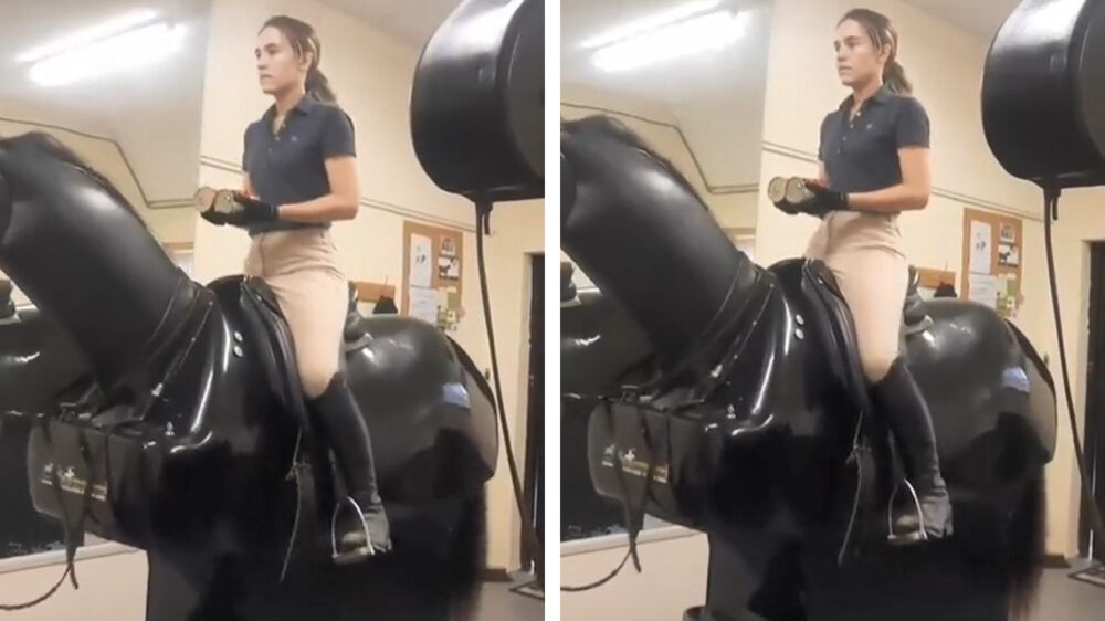 Wist je dat je helemaal geen paard nodig hebt om te rijden? Gewoon droog oefenen in de bijkeuken kan prima! Groovy nummertje hoor.