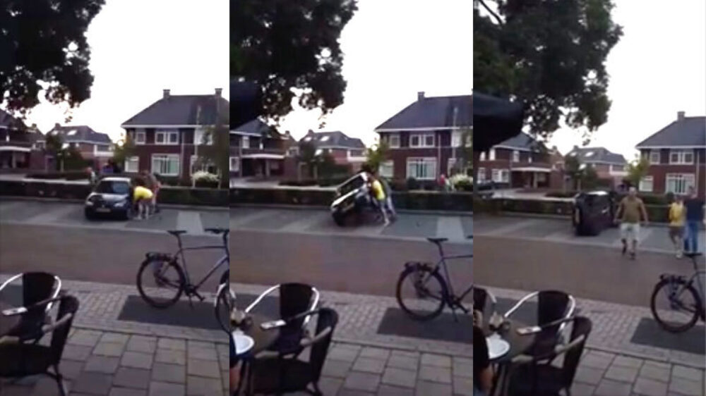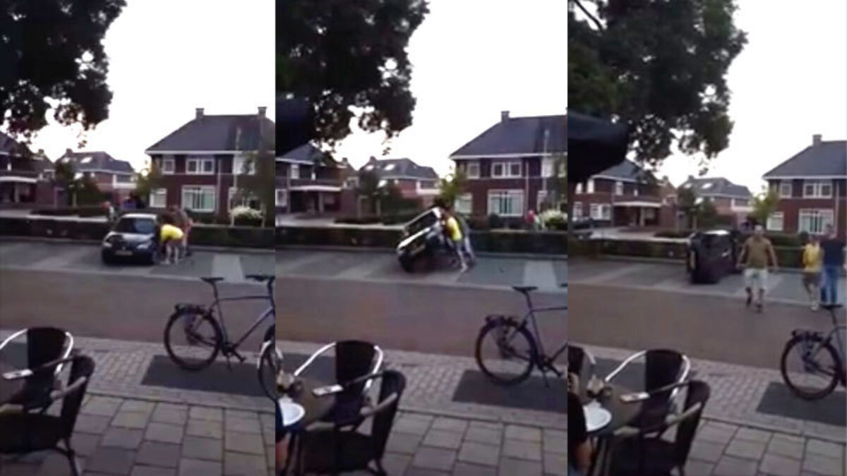 'Stoere' kerels knikkeren auto op z'n zijkant omdat 'ie niet netjes staat geparkeerd