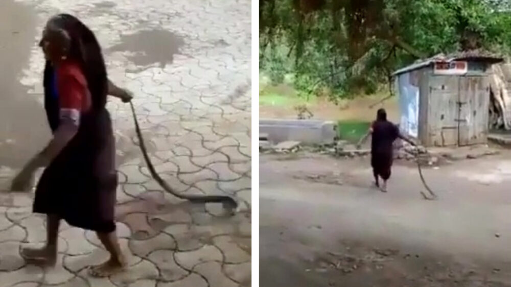 Deze cobra dacht even lekker huis te gaan houden in dit dorpje in India, maar hij had duidelijk even geen rekening gehouden met oma. Die zorgt er namelijk wel voor dat haar mede-inwoners veilig blijven. Optiefen!