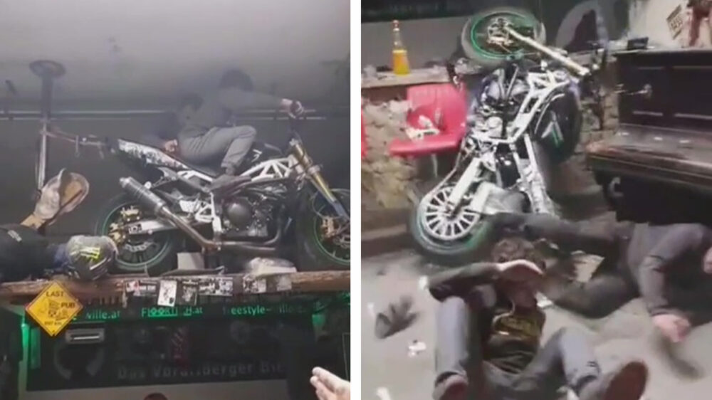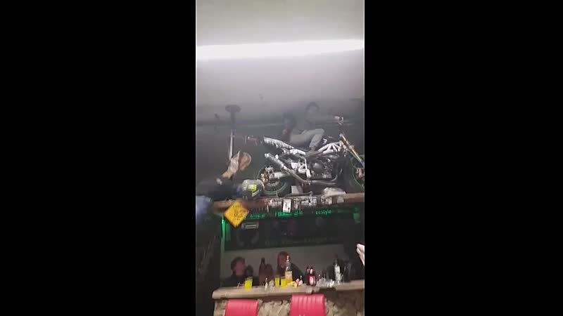 Prima kroegdecoratie natuurlijk, zo'n motor boven de bar, maar er straalbezopen een #burnout mee willen maken is gewoonweg niet heel erg slim. Understatement.