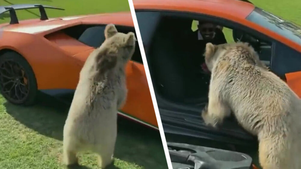 Je zou toch zeggen dat de meeste mensen niet zo blij zijn als iets of iemand de deur uit je Lambo sloopt, maar dit is naar verluidt in Saoedi-Arabië en dan zit het over het algemeen met de knaken wel goed. Beren als huisdier zijn daar ook héél normaal, dus eigenlijk is voor hen een doodnormale video. Denken wij toch net even anders over.