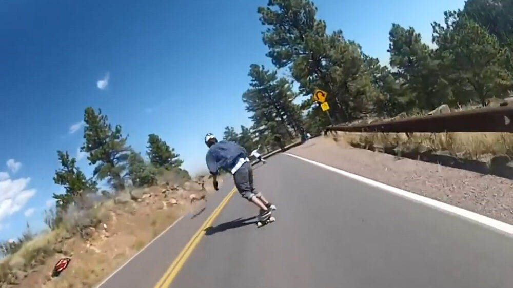 Longboarder jankt naar beneden en kan overstekende Bambi net niet ontwijken