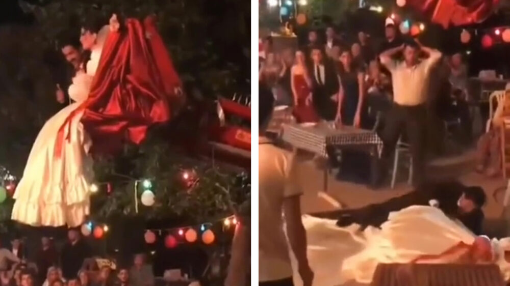 We weten eerlijk gezegd niet waar ter wereld het traditie is dat het bruidspaar in een bak van een shovel gaat zitten, maar na het zien van deze beelden kunnen we je het alleen maar afraden. Auw.
