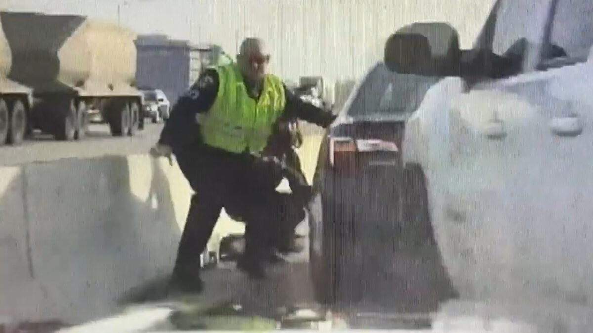 Gevalletje close call van de week als een agent van de staatspolitie van Idaho moet wegspringen om te voorkomen dat hij wordt geraakt door een tegemoetkomende pick-uptruck. De agent kwam kijken of 'ie kon helpen bij een automobilist met een lekke autoband.