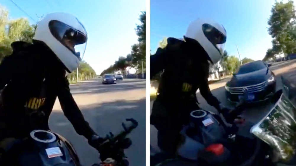 Even keren op de weg zou niet zo ingewikkeld moeten zijn, maar zéker als motorrijder zou je je er toch van bewust moeten zijn dat er nog een auto aan komt stormen. Midden in zijn pad stil gaan staan is dan ook niet de allerbeste optie...