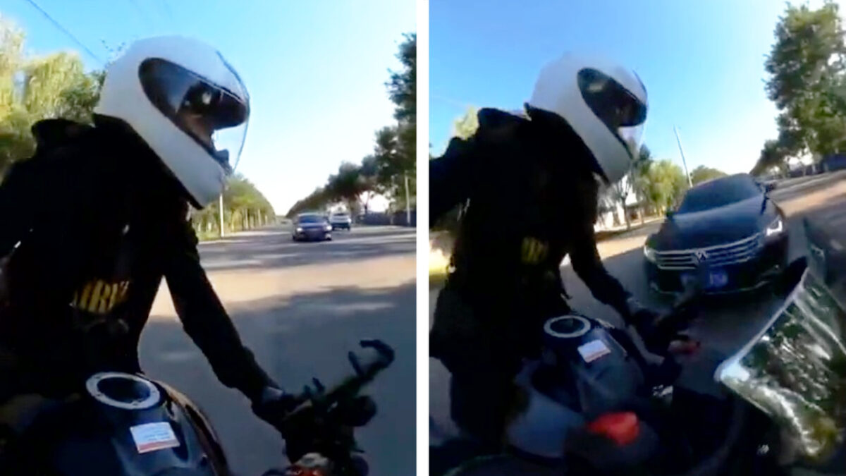 Even keren op de weg zou niet zo ingewikkeld moeten zijn, maar zéker als motorrijder zou je je er toch van bewust moeten zijn dat er nog een auto aan komt stormen. Midden in zijn pad stil gaan staan is dan ook niet de allerbeste optie...