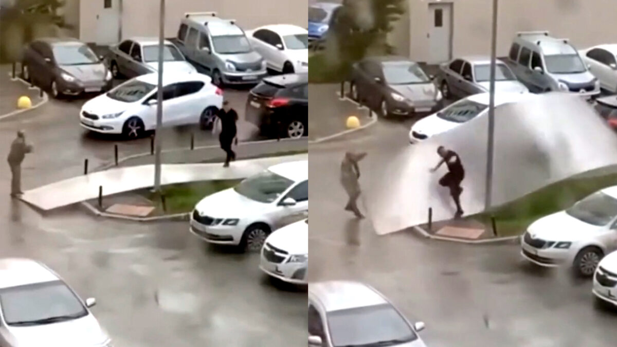 Dankzij een windvlaag in China kon deze medewerker windsurfen op een parasol
