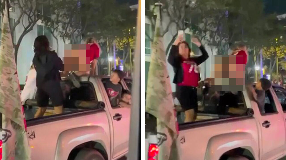 Als er iets te vieren valt klim je natuurlijk op het dak van je auto om voor Jan en alleman met je billen te schudden terwijl je kinderen braaf op de achterbank zitten. Opvoeding anno 2021, jeweetzelluf.