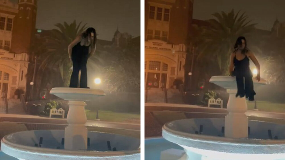 Plons: Gina gaat kopje onder als ze van een fontein wil klimmen