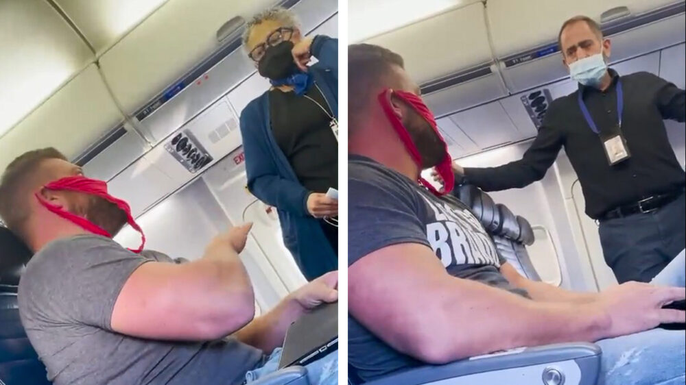 Adam Jenne wordt het vliegtuig uitgezet omdat hij een string als mondkapje gebruikt
