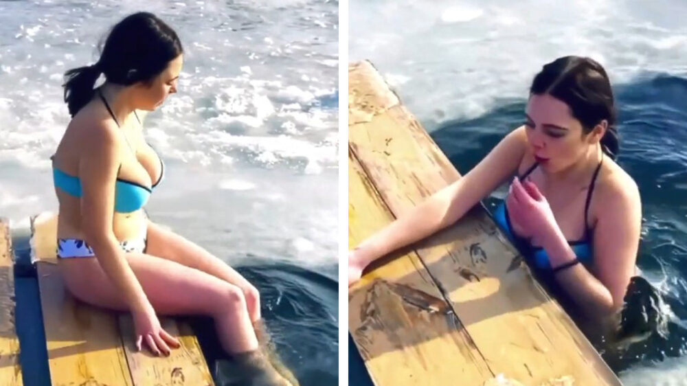 Brrr! Russische matroesjka laat zich dompelen in ijskoud water