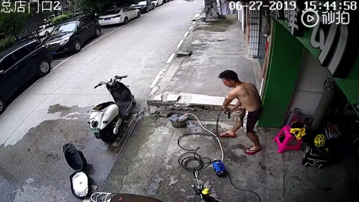Chinees redt zichzelf van elektrocutie door net op tijd in te grijpen