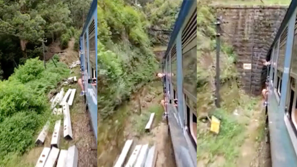 Idioot geniet van het mooie uitzicht in een rijdende trein Bizar