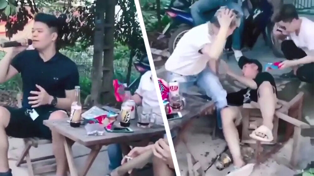 In Azië mag karaoke niet ontbreken bij een avondje doorzakken met je vrienden. Wel sympathiek dat hij meteen even het kapsel van zijn mattie blondeert!
