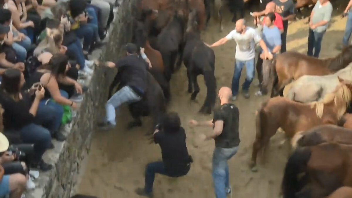 Spanjaarden worstelen met wilde paarden tijdens het 'Rapa das Bestas' festival