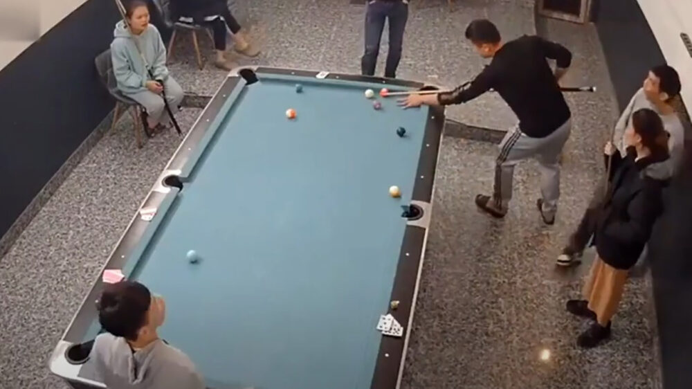 Na een reeks succesvolle schoten plaatst deze pro met precisie een biljartbal knoeperhard in het gezicht van zijn ex-vriendin*. Dat zal d'r leren!
