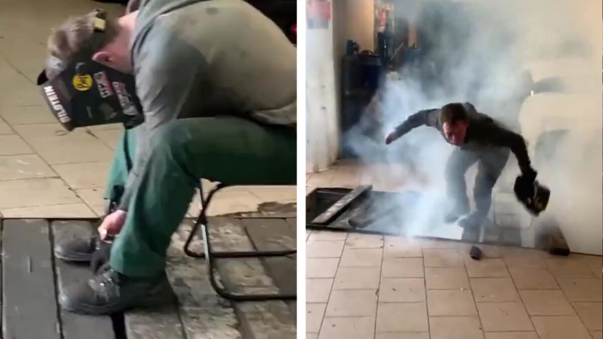 Sommige ideeën moet je gewoon ideeën laten. Niet uitvoeren. Zoals het afsteken van een stuk vuurwerk (waarvan we gokken dat het niet categorie 1 is) in een soort smeerput met planken én jezelf erop. Dat is vragen om een pijnlijke poeper en potentieel een plank voor je bakkes. Komt 'ie goed weg!