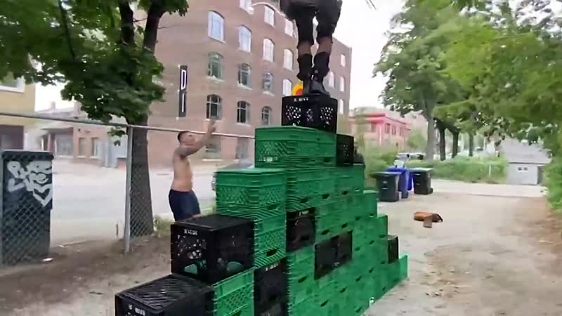 Klinkt zo makkelijk, over een paar melkkratjes naar de overkant lopen, maar schijn bedriegt: het is natuurkundig bijna onmogelijk en leverde dan ook knetterharde valpartijen op.