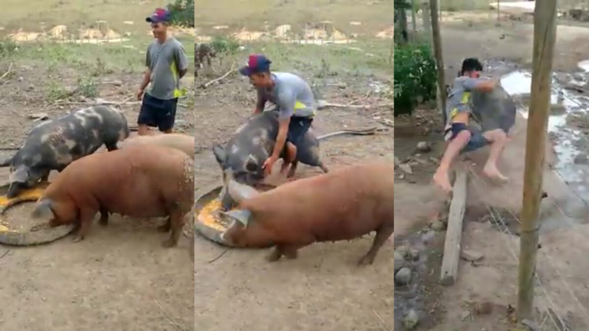 Varken gooit overmoedige rodeorijder in het prikkeldraad Fails